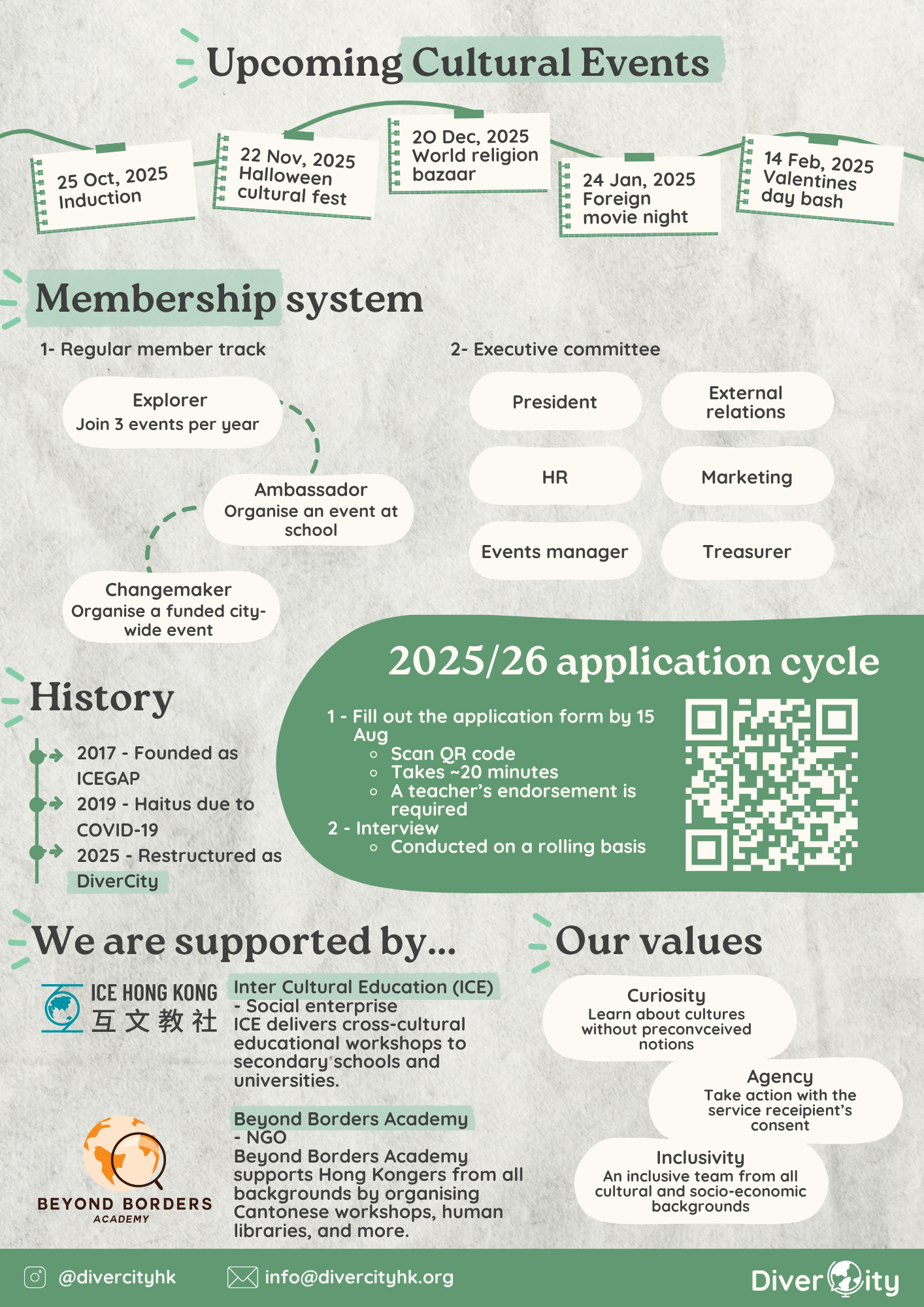 If you have any inquiries, please feel free to email us at info@divercityhk.org or DM us on Instagram at @divercityhk!