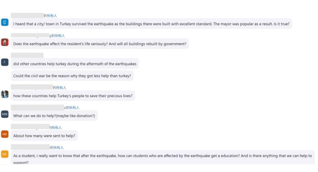 互文教社致力於提升公眾對世界及多元文化的認識和理解。今次我們邀請到在港留學的土耳其學生,分享土耳其震後的真實情況及高死亡率背後的潛在因素,了解這場災難如何影響當地人的生活及他們的未來。通過本次活動,我們希望學生能夠從主流媒體以外的不同角度深入認識這場災難,以及如何為災民提供支援。